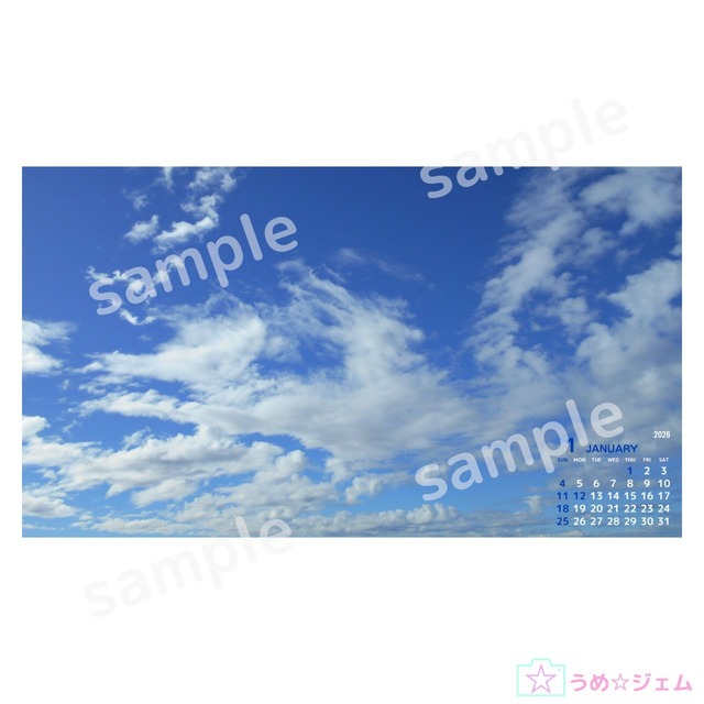 2026年1月のカレンダーです。 写真は「空と雲」シリーズです。 PC壁紙のほか、利用範囲内でご自由にご利用ください。 2026年1月カレンダー vol.1 ・ファイルの種類 PNGファイル 大きさ 1920×1080 サイズ 2.2MB 解像度 96dpi ビットの深さ 24 ※ダウンロード商品のため、ご購入後の返金・交換・キャンセルはお受けできません。 ※お使いのパソコンやスマホにより、画面の色調が若干異なる場合があります。 また、印刷される場合は、プリンターや用紙によって色調等が異なりますので、 予めご了承ください。 【利用範囲】 個人・法人利用、商用利用が可能です。 使用例 ・ホームページ、ブログに使用 ・SNS投稿に使用 ・PC壁紙、待ち受け、アイコンなど ・マーケティング素材(各種カード、名刺、チラシ、広告 など) ・素材を利用したオリジナルグッズの制作・販売 ・その他 【禁止行為】 素材の著作権を所有しておりますので、下記の行為は禁止とさせていただきます ・素材を無加工の状態で販売、配布、複製 ・商標登録 ・その他法的に認められている引用の範囲を超えた無断転載