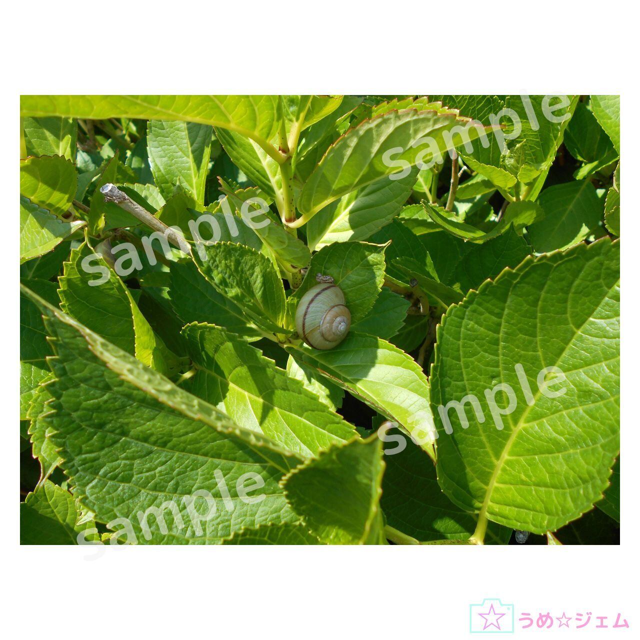 「額紫陽花(ガクアジサイ)の葉とカタツムリ」の写真です。