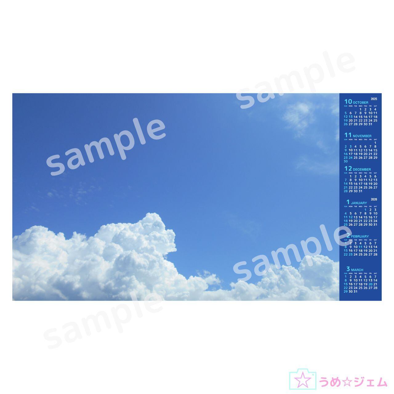 2025年10月~2026年3月の6か月カレンダーです。