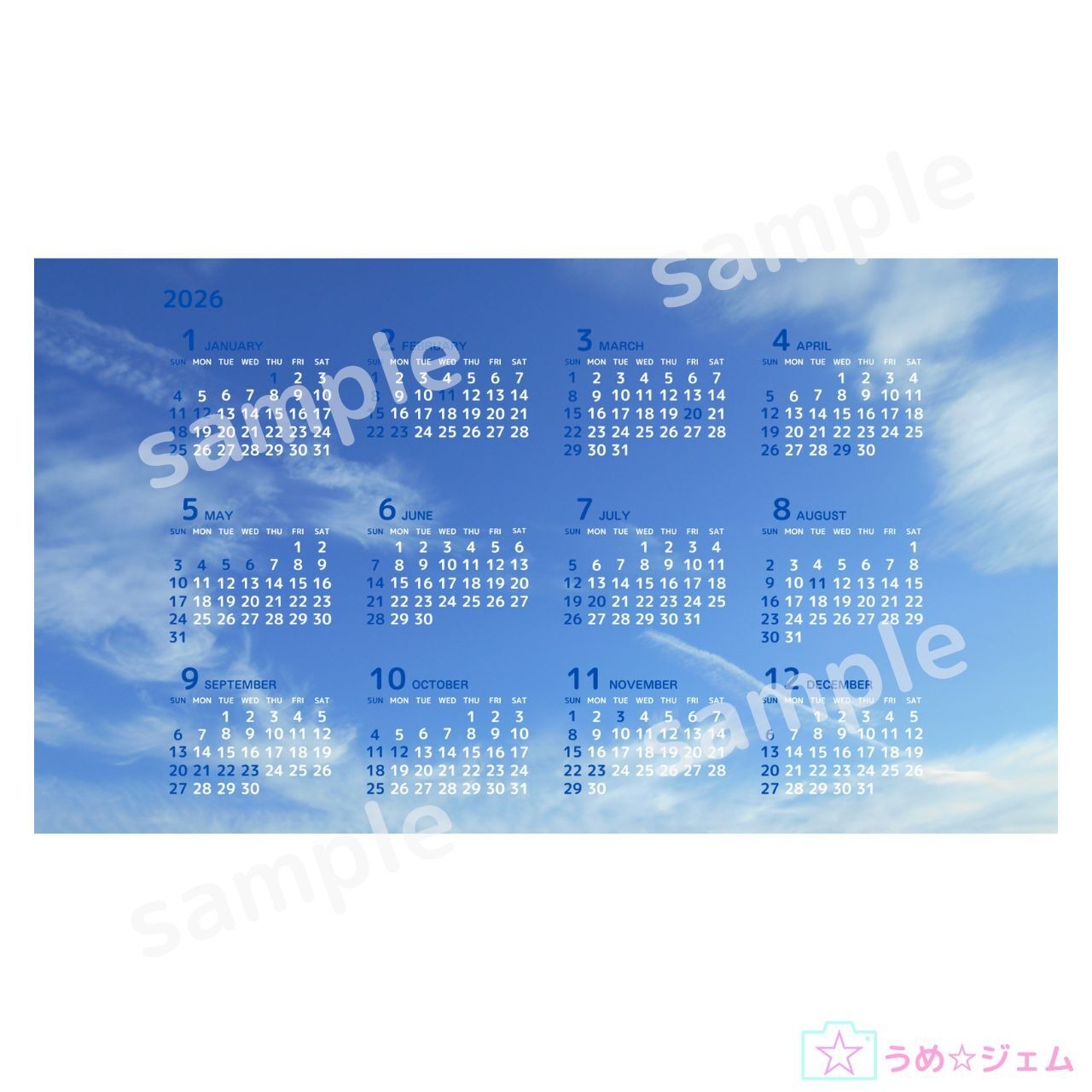 2026年1月~12月の12か月カレンダーです。